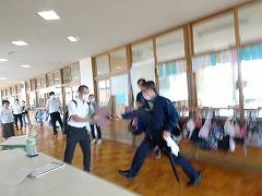 ↓これは不審者対応訓練の職員研修です。津幡警察署の方を講師として招聘し、不審者に対してどのように安全を守るか訓練しました。
