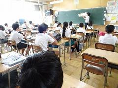 ↓夏休み読書感想文の課題図書について、学校司書、司書教諭による学年ごとのブックトークをしています。本の内容が少しわかると、課題図書に興味を持って読んでみたいという気持ちが高まります。この夏休み、読書に親しんでほしいと思います。