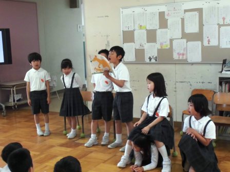 3びきのこぶたのお話をおもしろおかしいお話に変えて、6年生を喜ばせました。