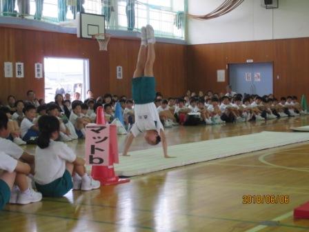 今まで練習してきた縄跳び技を全校の前で披露しました。