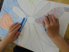 ↓4年図画工作 まぼろしの花 花のデザインをして、色もそれぞれに付けていきました。途中ですが、いったん友だちの作品を見合う時間を取り、自分の作品づくりの参考にしました。