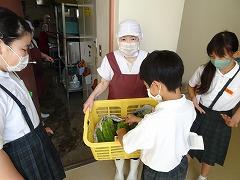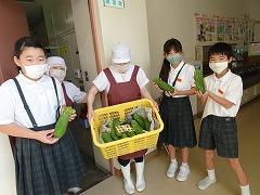 ↑今日の給食は、いわしの梅煮、太きゅうりの胡麻酢和え、めった汁でした。太きゅうりは、胡麻酢和えの中に入っています。コリッとした食感、夏の爽やかな風味が感じられました。これから、太きゅうりは、どんどん収穫されることでしょう。家でも食材として使うことが多くなってきそうですね。