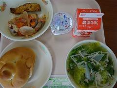 ↓今日の給食は、米粉ミルクロール、魚の香草パン粉焼き、根菜ラタトゥイユ、レタススープ、アジサイゼリーです。魚の香草パン粉焼きは、調理師さんたちが特に工夫を凝らしたとっておきメニューで、「どこのレストランにも負けないくらいおいしく仕上がりましたよ」とのことでした。まさしくその通り、カリっと焼き上がり、オリーブなどの香りが魚の旨味とマッチして、口の中に何とも言えない豊かな香りでいっぱいになりました。ラタトゥイユとは、フランスの郷土料理で夏野菜の煮込み料理だそうです。とてもおしゃれなメニューでした。今日のデザートはアジサイゼリーで、例年6月12日ごろが石川県の梅雨入りということで、今日は「梅雨入りメニュー」でした。