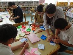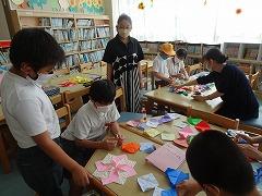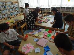 ↑図書ボランティアさんが、夏の飾りつけに来てくださいました。休み時間には子供たちもお手伝いをしました。