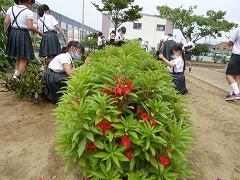 ↑3の3 理科でホウセンカの観察に来ました。葉の数、茎の背丈、茎の太さ、以前の観察記録と比較すると、ずいぶん生長したことが分かります。