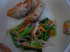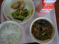 ↑今日の給食は、マーボナス、揚げ餃子、小松菜のナムルでした。マーボナスのナスは、美しい紫色で、このような美しい紫色になるところがプロのわざです。味も抜群、いつもおいしい給食をありがとうございます。
