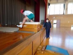 ↓ 5年体育 跳び箱に挑戦です。ステージの下から走り、踏み台を強く踏んで、ステージの上にセッティングしてある跳び箱を飛び越します。