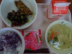 ↓今日の給食は、ゆかりごはん、アジの香味揚げ、ひじきの炒め煮、じゃがいもとわかめの味噌汁、そして、デザートには、いちごアイスがつきました。