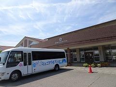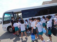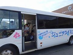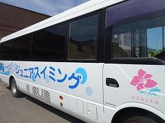 津幡町にアザレアがオープンし、町内の3年生が1クラスずつ2回、アザレアでプールの授業を受けることができます。そのトップバッターが条南小3年1組、アザレアのバスが条南小に迎えに来てくれました。かわいいペンギンのキャラクターとアザレアの花が描かれている、素敵なバスに3年1組さんはわくわくしながら乗り込みました。