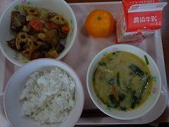 ↓今日の給食は、豚肉とれんこんの黒酢あん、豆乳ごまたんたんスープ、みかんでした。体が温まるスープでした。
