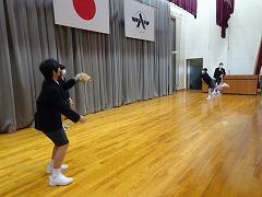 2月学校集会を行いました。1月に大谷翔平選手からいただいたグローブは、各学級に回し、全員手に取ってはめてみました。今日は大谷グローブを使って、始球式を行いました。6年生の代表の皆さんがキャッチボールとピッチングを披露しました。