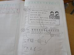 ↓1年生 算数 何番目の学習です。図を描いて、お話問題の意味を理解しています。