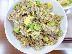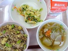 ↓今日の給食です。デザートのカップでヤクルトは、都合でにより、29日(木)の給食にデザートとして出されることに変更となりました。今日のメニューは、さばそぼろご飯、みそ炒め、のっぺい汁でした。さばは体に良くヘルシーな食材で、そぼろにしてたっぷりおいしくいただくことができました。