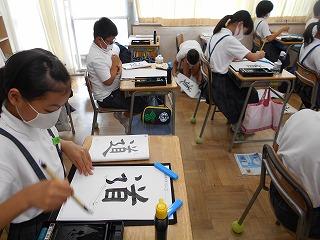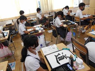 ↑5の1 習字 「にょう」の「とめはらい」に気を付けて書きました。手本を見て、丁寧に力強く書いています。
