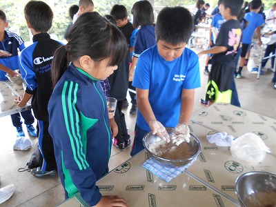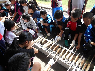力を合わせて,生地をこねて,モチモチのパンを作りました。竹に巻きつけ,炭火で焼きました。