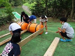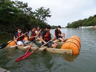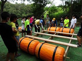 ↑ 浮きに竹竿を通して、木の板を乗せ、11本のロームでしっかりと結んで固定しました。班の協力のおかげでみごと、イカダが仕上がりました!いよいよ、桟橋に向かって、班で協力してイカダを運びます。