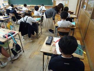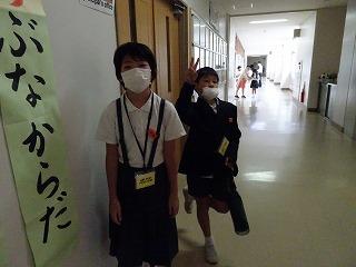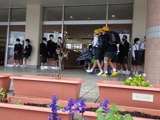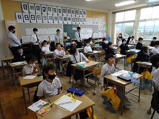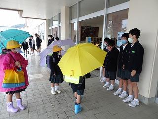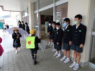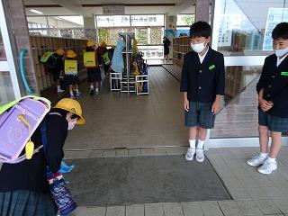 ↑玄関前でも、5.6年生があいさつを広めようとあいさつ運動に取り組んでいます。あいさつ運動のお兄さん、お姉さんに、あいさつをして学校に入ります。