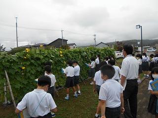 ↓4年生のヘチマもぐんぐん伸びています。4年1組がヘチマの観察をしています。