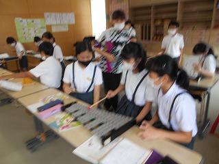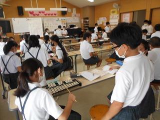 ↑2年1組 音楽です。音の長さに気を付けて鉄琴で「ぷっかり くじら」を演奏しました。