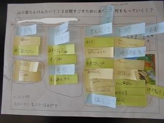 ↑3の3 国語 「山小屋で3日間すごすなら」これは、対話の練習の教材です。山小屋で3日間子供だけで過ごすことになりました。ふだん子供だけではできないことをして、自然と触れ合う体験をします。どんなものを持っていくか話し合います。グループでしたいことを決め、持っていくものを話し合いました。付箋紙に書いて、比較したり分類したりして、対話の仕方について学んでいます。