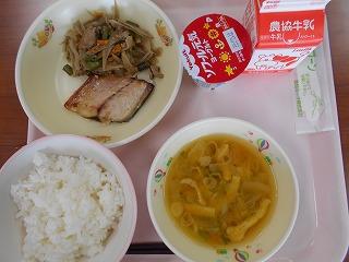 ↑今日の給食は和食です。きんぴらごぼうには、ごぼうのささがきがたっぷり入っていて、食物繊維を豊富にとることができました。豚肉が入っているので、子供達も食べやすくなっています。さばは、塩こうじに付け込んであり、さばの旨味が引き出されていました。味噌汁にはかぼちゃが入っていて、彩りもよく、旬の野菜がたっぷり、栄養たっぷりのメニューでした。
