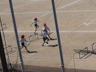 ↑ 運動場では4年生が、障害物競争、ハードルの学習をしています。リズミカルに跳ぶことができるよう試走をしました。