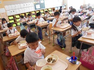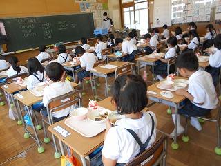 ↑高学年の給食はランチルームで、座席は1つ空け、一方向を向いて食べています。おしゃべりはなく、静かに音楽を聴いて食べています。その分、よく噛んで味わっています。今日からは簡易給食ではなく通常の給食です。さばの味噌煮、きんぴら、沢煮椀で和食メニューでした。