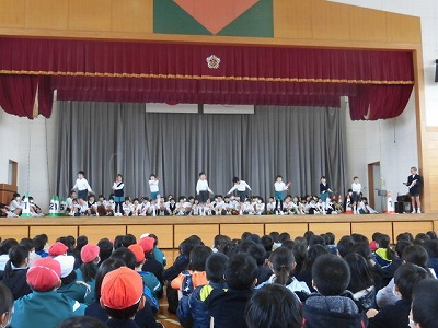 昨日の昼の時間に,校内なわとび発表会がありました。1月からなわとび大作戦で練習してきた跳び方を全校に披露しました。1年生から6年生の代表の児童が1一人技や2人技,3人以上の技など色々なスゴ技があり,歓声があがっていました。