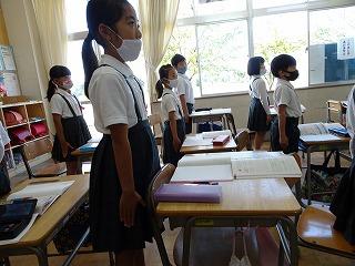 ↑2の1 1限目のスタートのあいさつ、背筋がまっすぐに伸びて、指先もまっすぐ、目はしっかり「学級目標」を見て、テンポよくあいさつができます。心がそろっていて、すてきです。