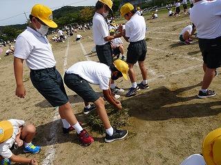 ↑昼休み後に、全校で運動場の草むしりをしました。489名が、一人一人の力を発揮してくれたので、20分間でグラウンドがたいへんきれいになりました。協力の力です。運動会も気持ちよく行うことができそうです。