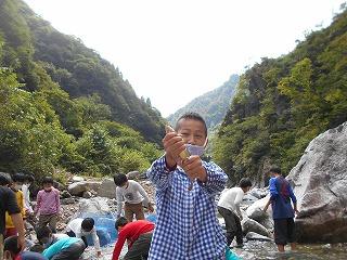 ↑ めっこ谷の河原で、いわなづかみの仕方や、いのちをいただくということ、安全な活動について、ヒロ先生のお話をお聞きしました。「このイワナは、3年ほど生活していたイワナです」