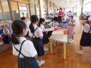 ↑ 給食2日目、1年生は給食準備を自分たちでがんばっています。年長さんの時から、何でも自分たちでしていたからでしょうね。小学校でも、給食の準備が手際よく、落ち着いてとても上手にできます。