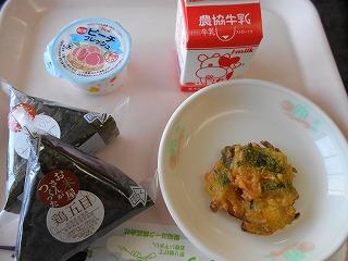 ↑ 今日の給食も1年生の盛り付けが簡単にできるよう、簡易給食で、おにぎりと野菜のかき揚げです。