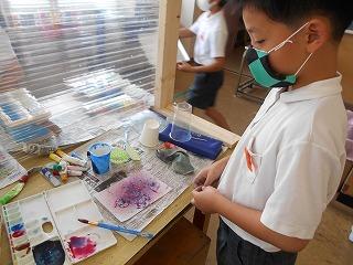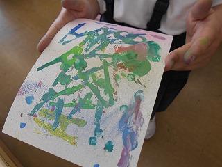 ↑こちらは4年生の図工です。ブラッシングしたり、ビー玉を転がしたり、偶然性を生かして芸術作品に仕上げました。色合いも素敵です。
