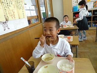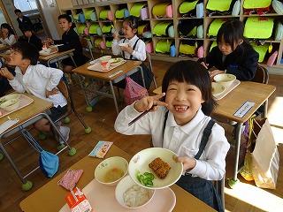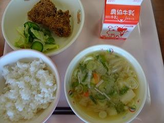 ↓今日の給食は、なんと、石川県のブランド、能登牛のカツです。そして、浅漬けと、あさりの味噌汁です。能登牛は、ステーキにもできるような上等の肉が来たそうです。調理師さんたちが、一つ一つ丁寧に衣をつけ、揚げてくださいました。子供たちも高級ブランド能登牛のあまりのおいしさに舌鼓を打っていました。