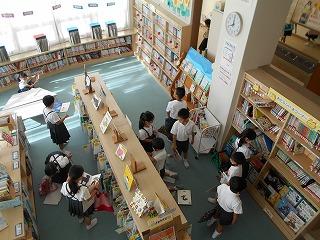 ↑朝休み、本の貸し借りに子供たちが図書館に来ています。毎日読書で、心に栄養を送ってください。