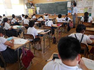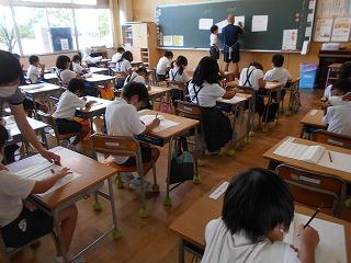 ↑6年2組 英語 新学習指導要領では、書くことも加わっています。学習した表現を手本を見ながら文章を書いています。