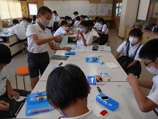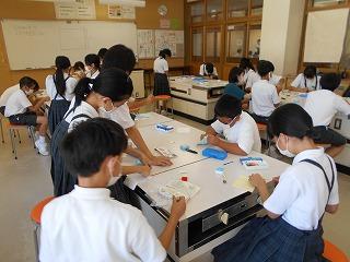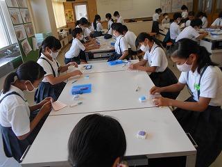 ↑5年2組 家庭科 手作りマスクづくりです。5年生は手縫いで、一針ずつ、丁寧に縫い進めていきました。