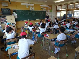 ↑5年生が英語インタビューにやってきました。Can you play soccer ? Yes, I can do a little.