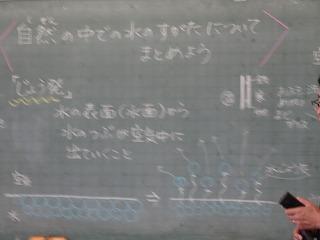 ↑4の1 理科 洗濯が乾燥する様子を、モデル図を描いて考えました。蒸発についての学習です。液体が空気中に出ていく現象を考えました。