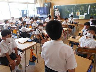 ↓ 2年生国語 話す聞く学習です。教科書のイラストを見て「友達をさがす」ために、聞き落としてはいけない所を整理しています。教室の中で話を聴く目の輝きがすてきです。「聴く」という学習の基本がしっかりと身に着いています。