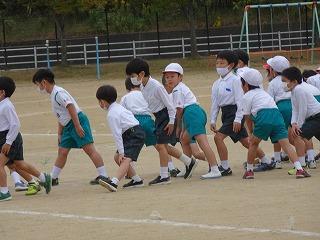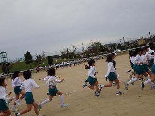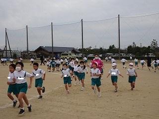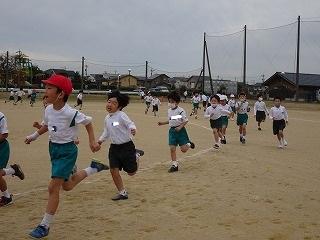学校では、「走ろうタイム」で、長休みの5分間、元気に走り、体力アップに取り組んでいます。今日は、1・3・5年生です。まずは、準備運動です。