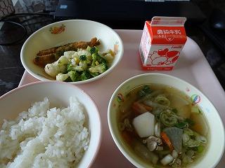 ↑今日の給食は、しゃもの磯部揚げ、花野菜のおかかマヨ和えに、野菜たっぷりの鶏ごぼう汁でした。花のつぼみの塊のブロッコリーやカリフラワーはビタミンCやビタミンAが豊富で、免疫力を高め、疲労回復にもってこいの食品です。鰹節にマヨネーズ和えで、子供にも食べやすい味付けとなっていました。ししゃもには、青のりがまぶしてあり、香りもよく、骨までしっかり噛んで食べる「カミカミメニュー」です。カルシウムをたくさん摂って運動もして体が強くなったと思います。毎日栄養バランス抜群の給食です。