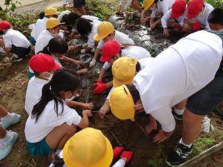 ↓2の1 秋の空の下で、さつまいもの収穫です。おいしそうな赤紫色のさつまいもが顔を出してきました!
