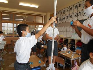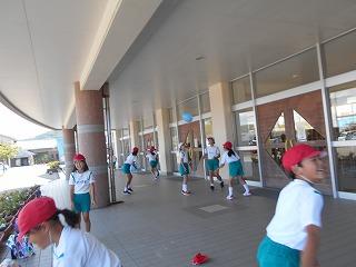 ↑ 今日から体育の実技を再開しています。4の3は玄関で、風船バレーをしました。玄関は風邪通しがよく、日陰となっています。久しぶりの体育を楽しんでいました。