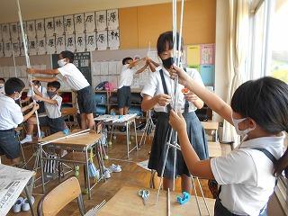 ↑4の3図工 友達と協力して、棒を組み合わせてできる形を楽しんでいます。この棒は、新聞紙で作られています。タワーやアンテナのようなオブジェを相談しながら作り上げていました。