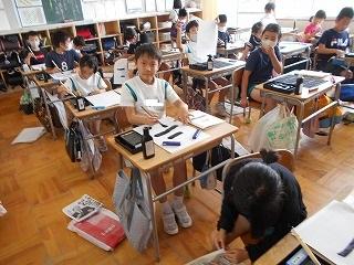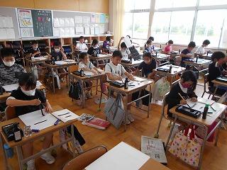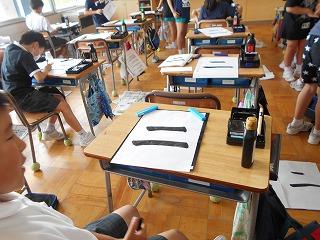 ↑ 3年2組 習字 3年生から習字の学習がスタートし、今日はいよいよ「二」を書きます。始筆の穂先の向きは、時計で言うと11時の方向です。筆を立てて、背筋を伸ばして、書きました。立派な文字が書けました。
