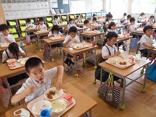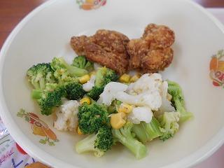 ↑ 今日の給食は、アサリがたっぷり入ったクラムチャウダー、花野菜サラダ、フライドチキン、ミルク食パンにりんごジャムです。カリフラワーやブロッコリーの花芽は栄養価が高く、カリウムやビタミンA、ビタミンCが豊富に含まれています。クラムチャウダーのアサリにもカルシウムやカリウム、亜鉛、鉄などが含まれ、疲労回復に大いに効果があります。今日は、パンの日で、ふわふわの食パンでした。フライドチキンは、子供たちの大人気メニューです。
