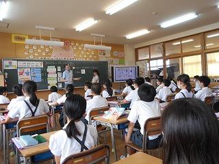 ↑ 6年2組 英語 研究授業 「How is your school life ?」自分の生活を見直して、どのように改善したらよいかを英語で、保健の先生に伝えようという学習をしています。外国語(英語)は小学校5,6年生では、今年度から正式に「教科」となり、週2時間学習しています。3,4年生は外国語活動で、週1時間、1,2年生は外国語活動を年間で10時間程度学習します。英語では、「自分が本当に伝えたいことを英語で伝える」という主体性を大切に学習を進めています。今回も、 [ I sometimes do my homework at 8:00.] を見直して、[ I usually do my homework at 6:00]にしたい等の文を言えるように練習しました。
