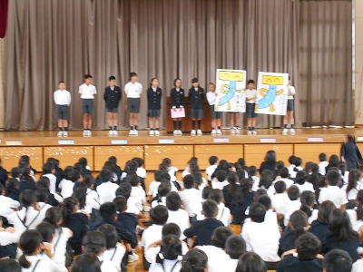生活委員会からは,「ギネスに挑戦!」の結果を発表してくれました。12日間で条南小の子ども達があいさつした人数は・・・「390487人」でした。素晴らしい結果ですね。誰にでも自分からあいさつできる条南っ子になってほしいですね。